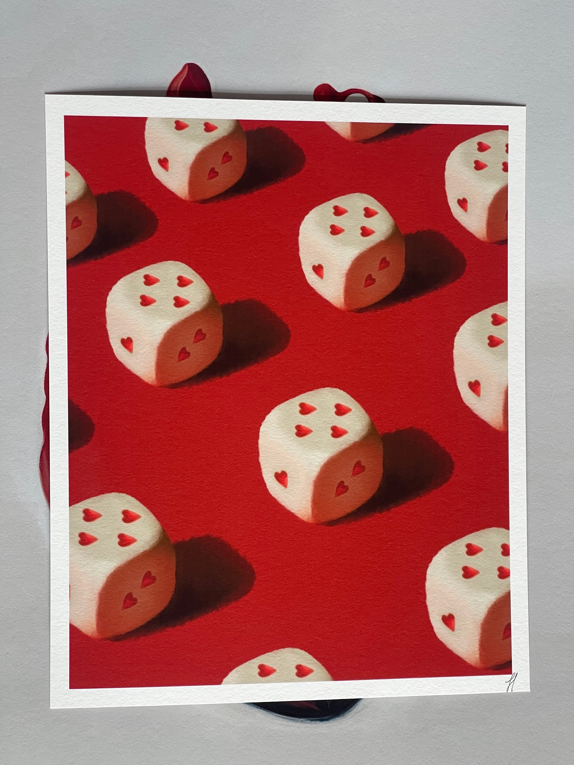 This artwork turns a simple die into a quiet celebration of self-love, using hearts in place of traditional dots and the numbers 1, 4, and 2 to gently say "I love me." Much like a die, life offers many chances, and choosing to honour oneself is one of the boldest rolls we can make. The heart-shaped pips speak where words might hesitate, offering a soft but steady reminder that love begins within. Whether it’s a whisper of encouragement or a proud declaration, this piece invites reflection on the importance of valuing who you are—no apologies, no conditions.