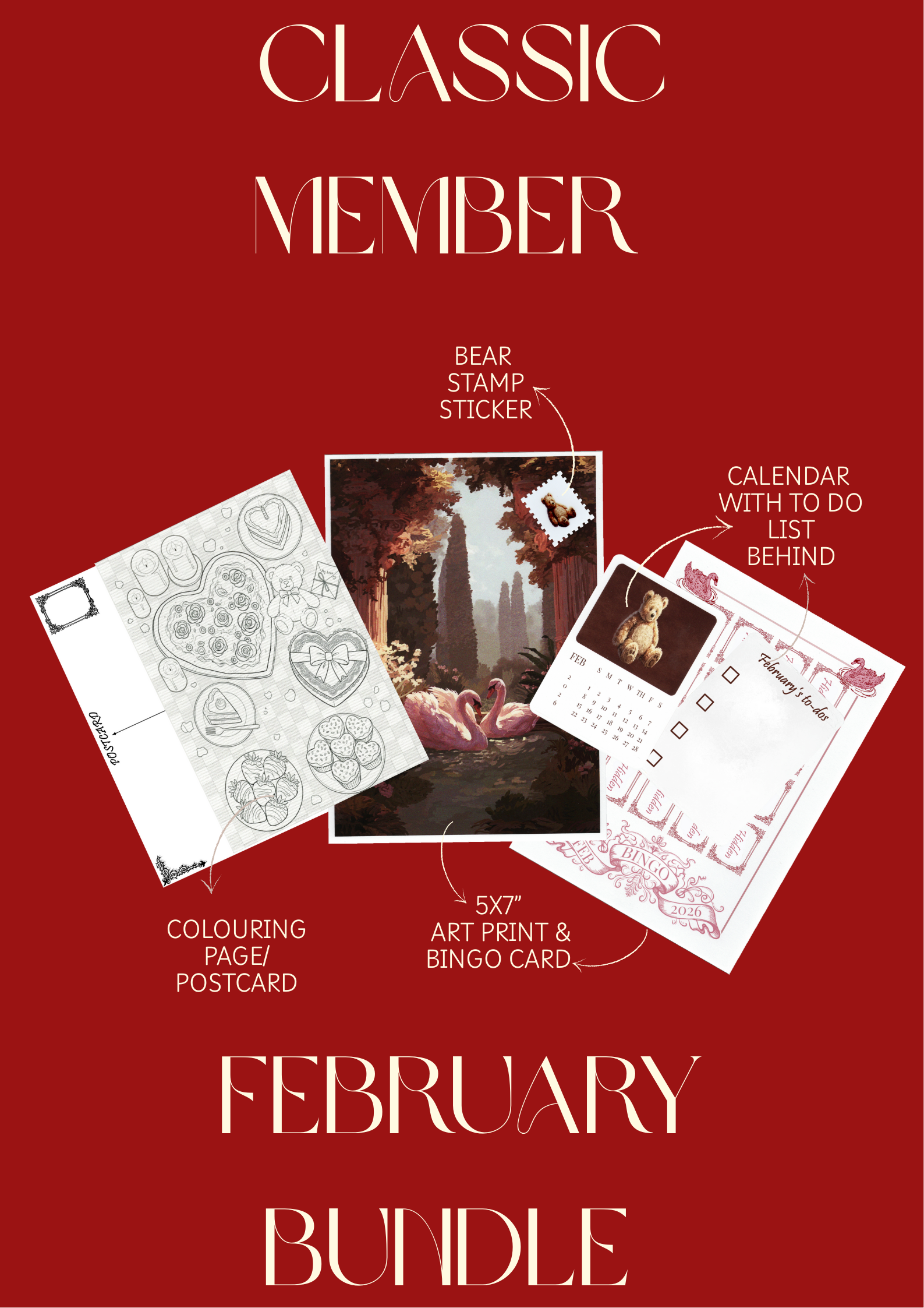 * Sticker(s) * Quote card or mini print * Postcard (s) * Bookmark (s) * Original drawing * Extra 5x7" print * Mini artwork stamps * A small game or activity * Month calendar