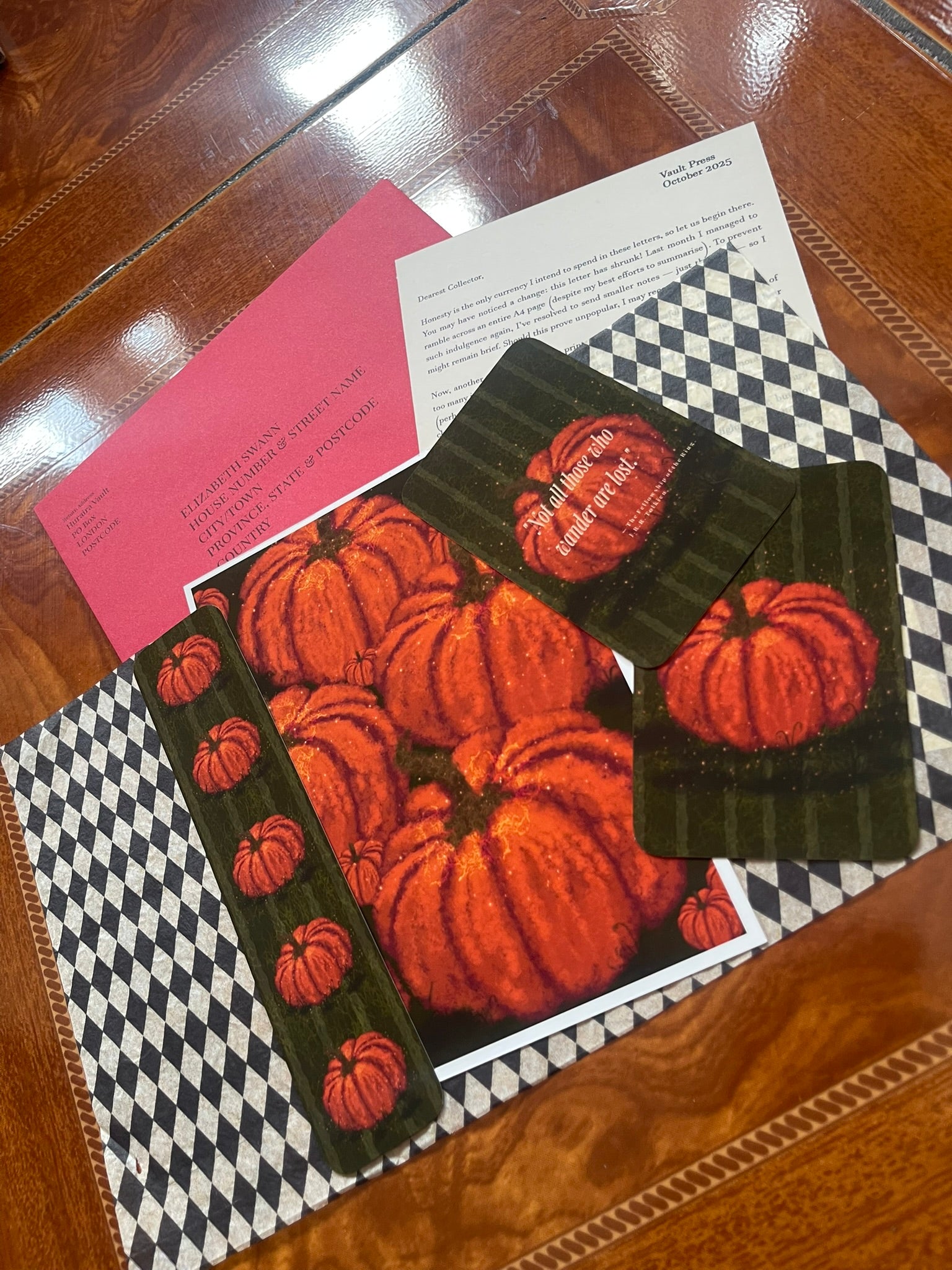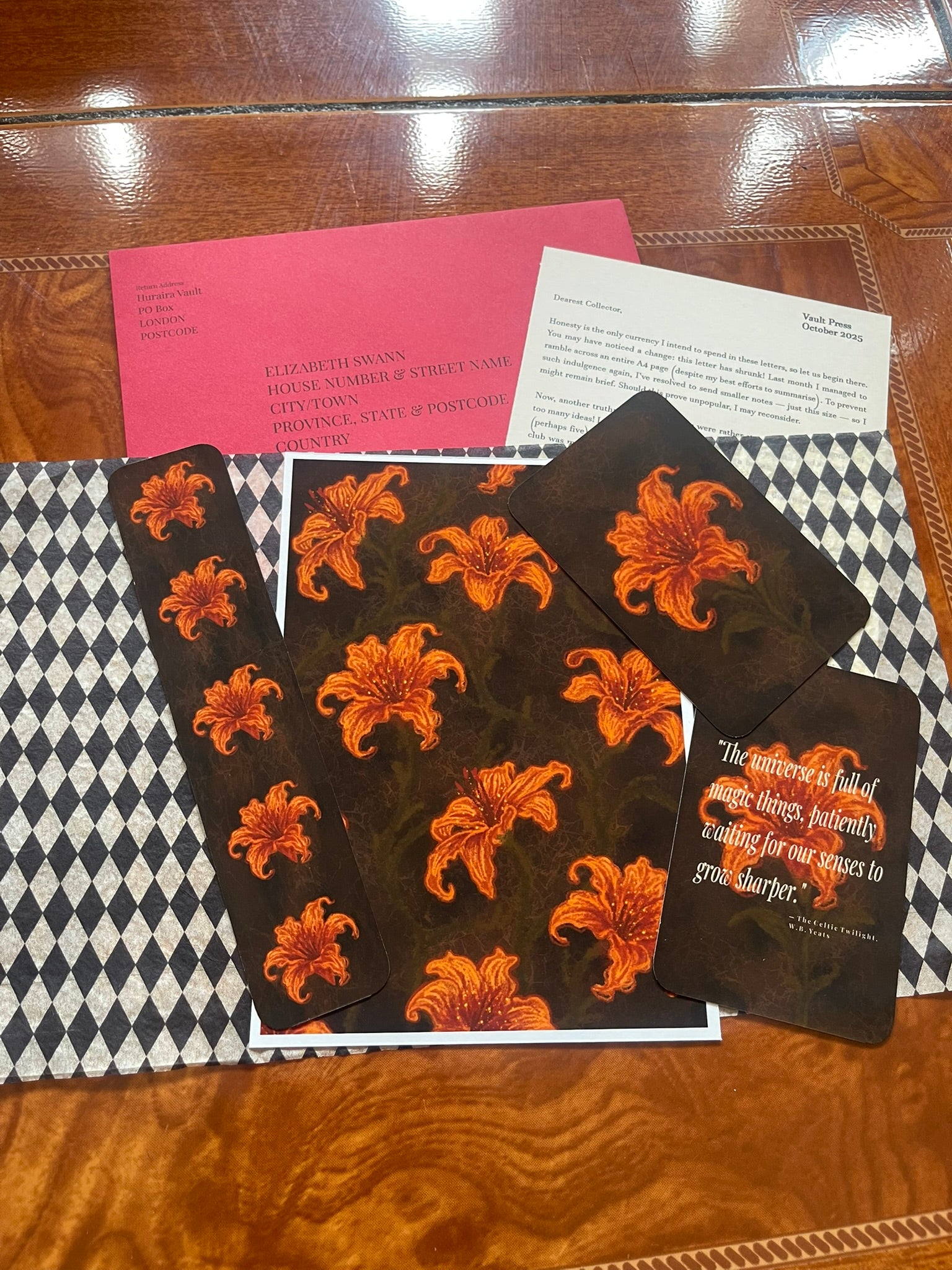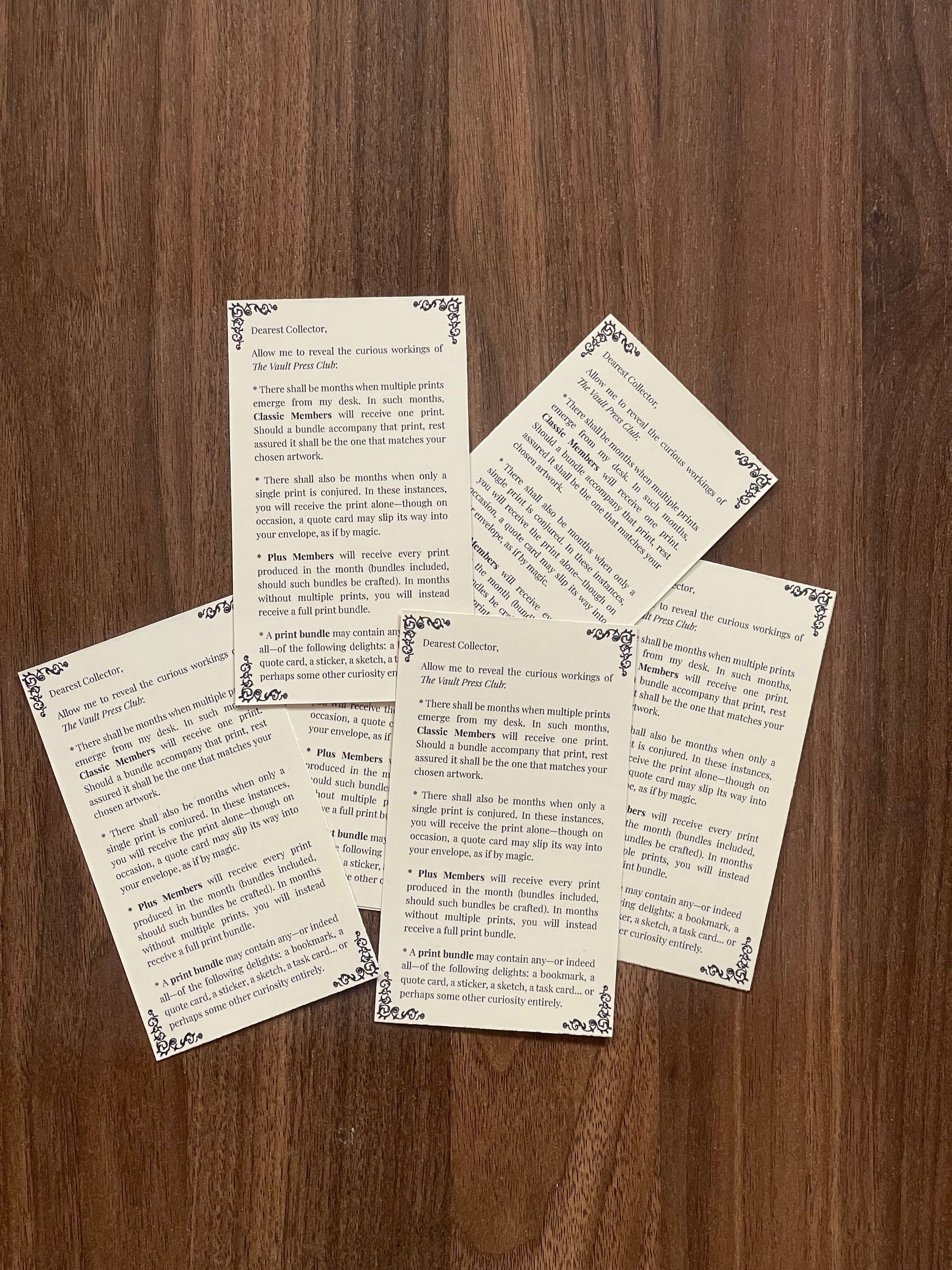 Classic Monthly Prints – Each month you’ll receive a hand-signed 5x7" print on Hahnemühle Photo Rag 188gsm, accompanied by a personal letter from me. If your print comes with a bundle, it will be thoughtfully curated to match your chosen artwork. A bundle may include any combination of: a bookmark, a quote card (which doubles as a mini print), a sticker, a sketch, a task card, or another creative surprise.