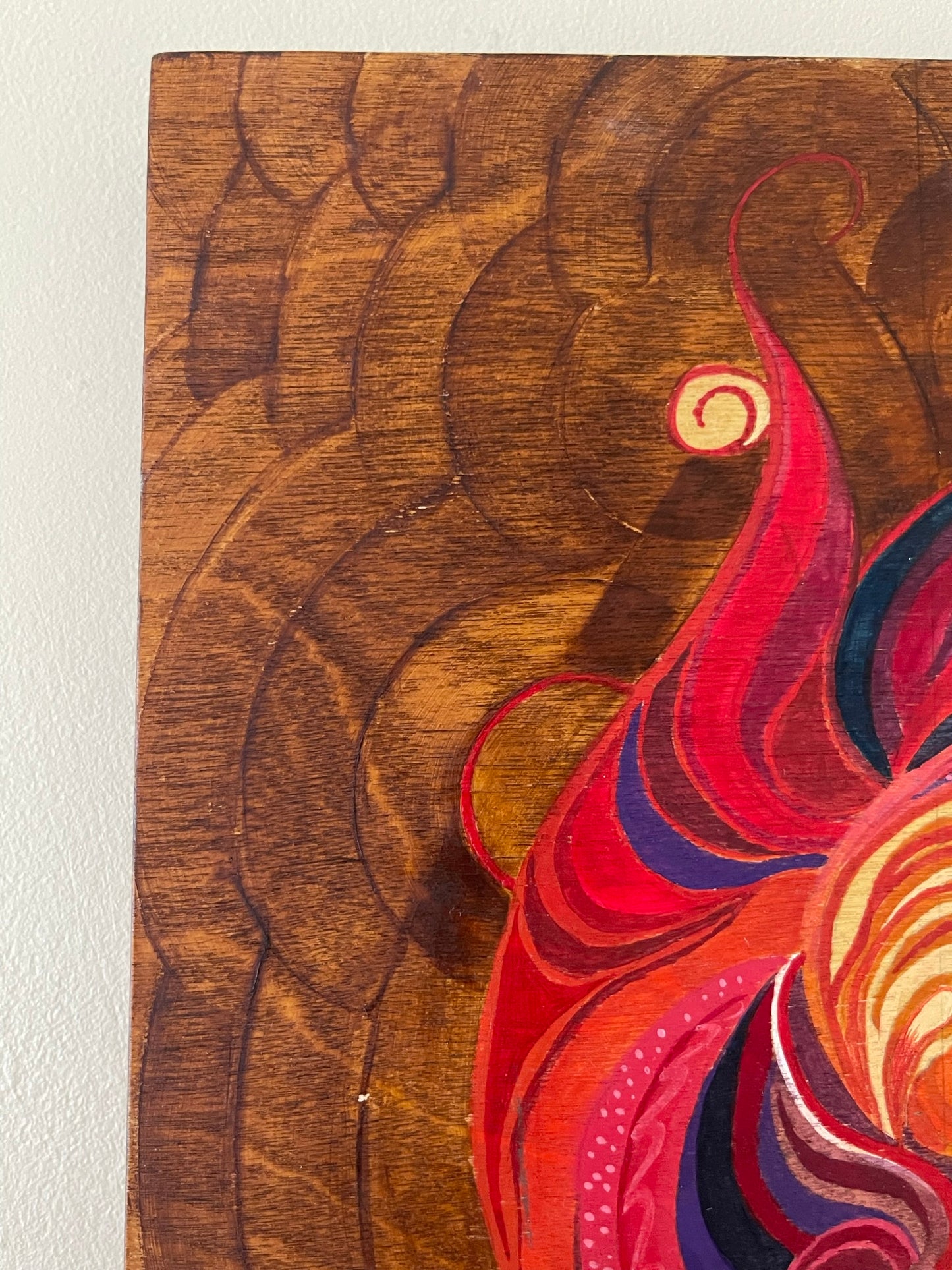 The name "Rhythms of the Heart" is inspired by both the physical and emotional elements present. "Rhythms" refers to the undulating, flowing patterns that echo the natural beats and pulses of a heart. The swirling shapes suggest motion, like the rhythmic contraction and expansion of the heart as it pumps blood or the flow of emotions that ebb and surge. "Heart" not only references the physical shape of a heart, which is subtly present in the design, but also represents the emotional core of a person—where feelings, passion, and life’s energy are centred. The vibrant reds, purples, and deep blacks reflect the wide range of emotions that the heart symbolises, from love and warmth to depth and intensity. Together, the title hints at the interplay of life and emotion, flowing and moving like the rhythms within a heart. It’s a celebration of life’s energy, as seen through the dynamic forms in your piece. "Interplay" emphasises the way life and emotions interact and influence each other, much like the waves and colours in your artwork.